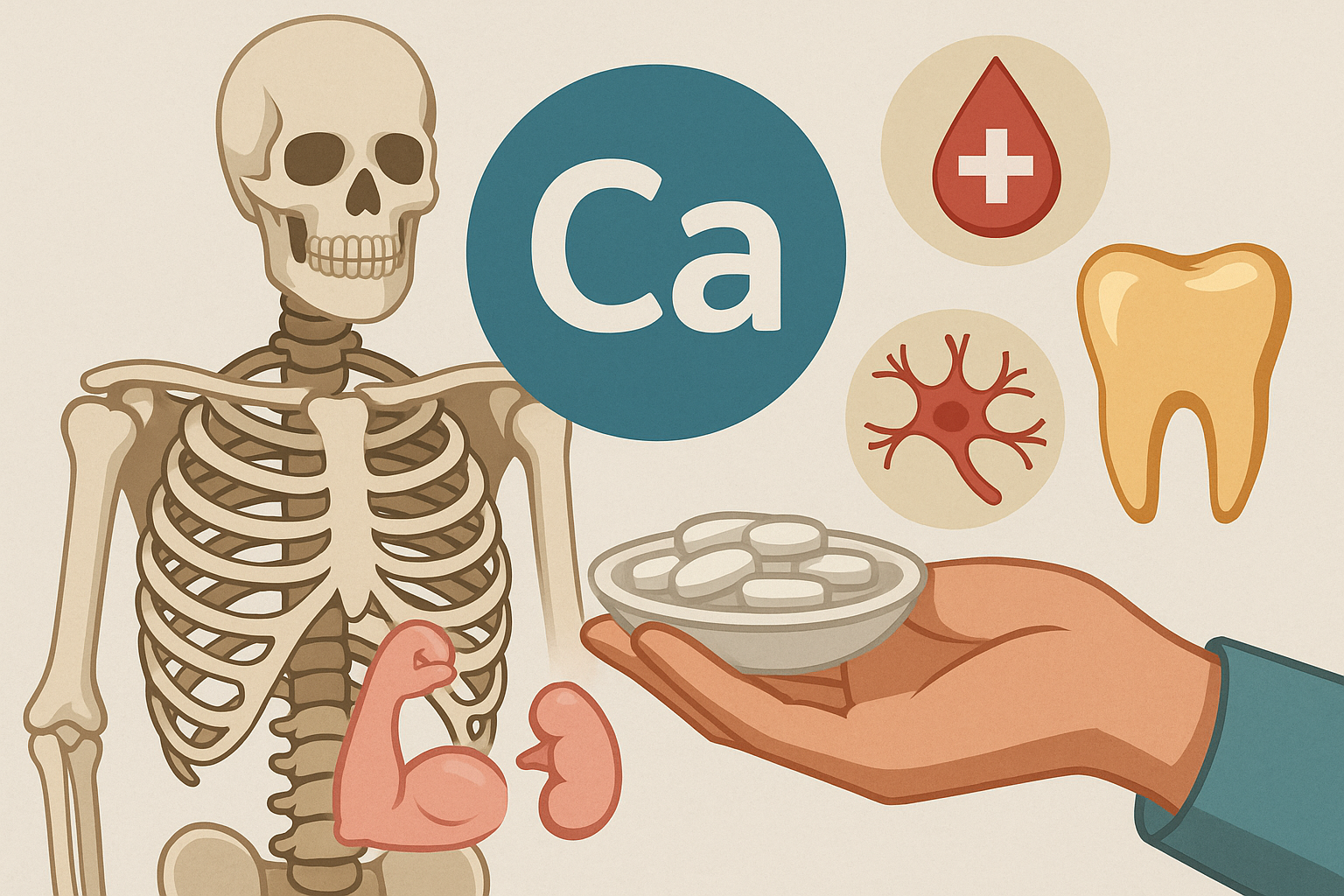 칼슘의 약 99%는 뼈와 치아에 존재하며, 이들의 구조 형성과 강화에 기여한다. 성장기에는 뼈 성장을, 노년기에는 골다공증 예방에 중요하다.